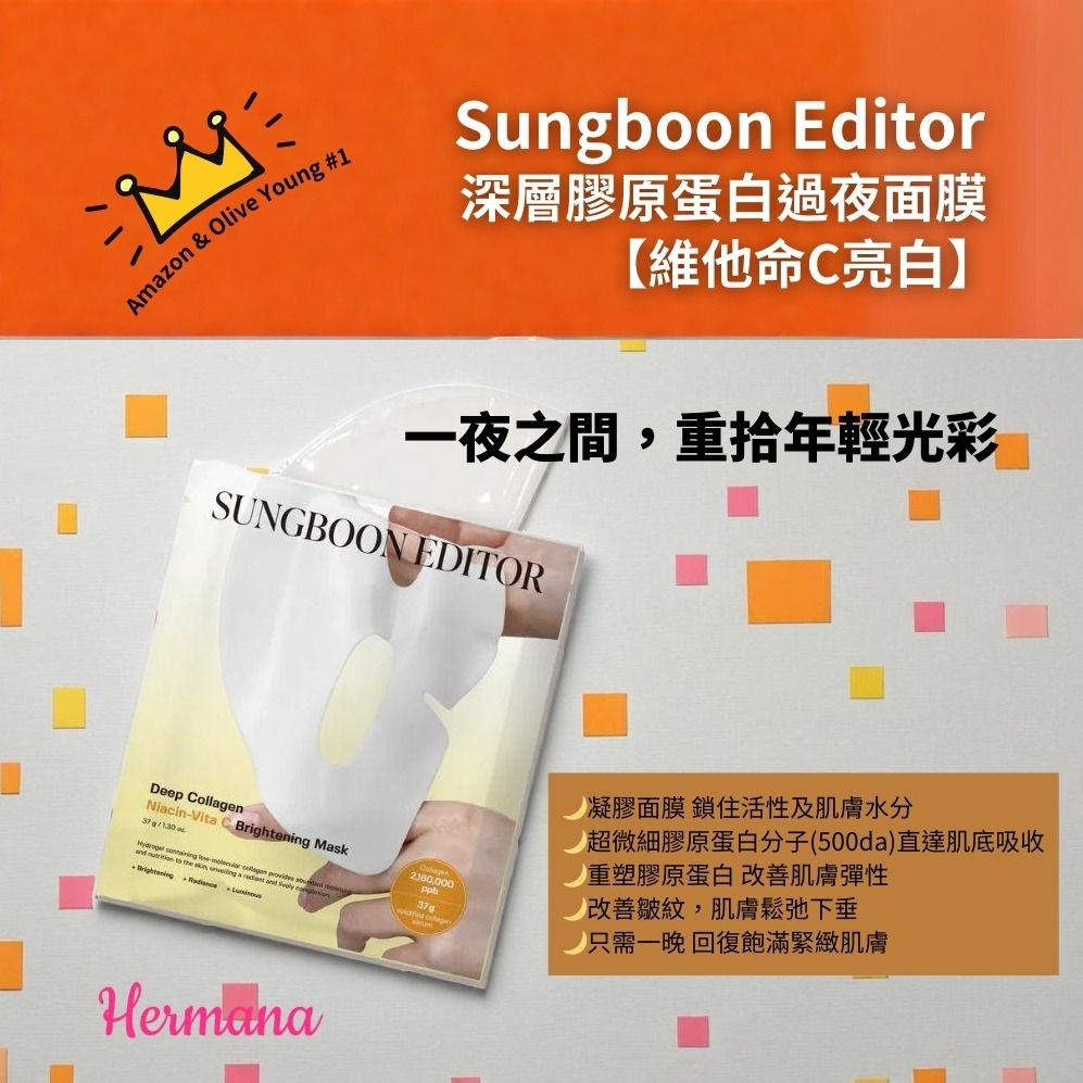 TEST來自韓國NO.1護膚品牌 SUNGBOON EDITOR,這款深層膠原蛋白維他命C亮白過夜面膜榮登美國Amazon及Olive Young Global面膜榜首,為您帶來極致亮白與緊緻體驗。