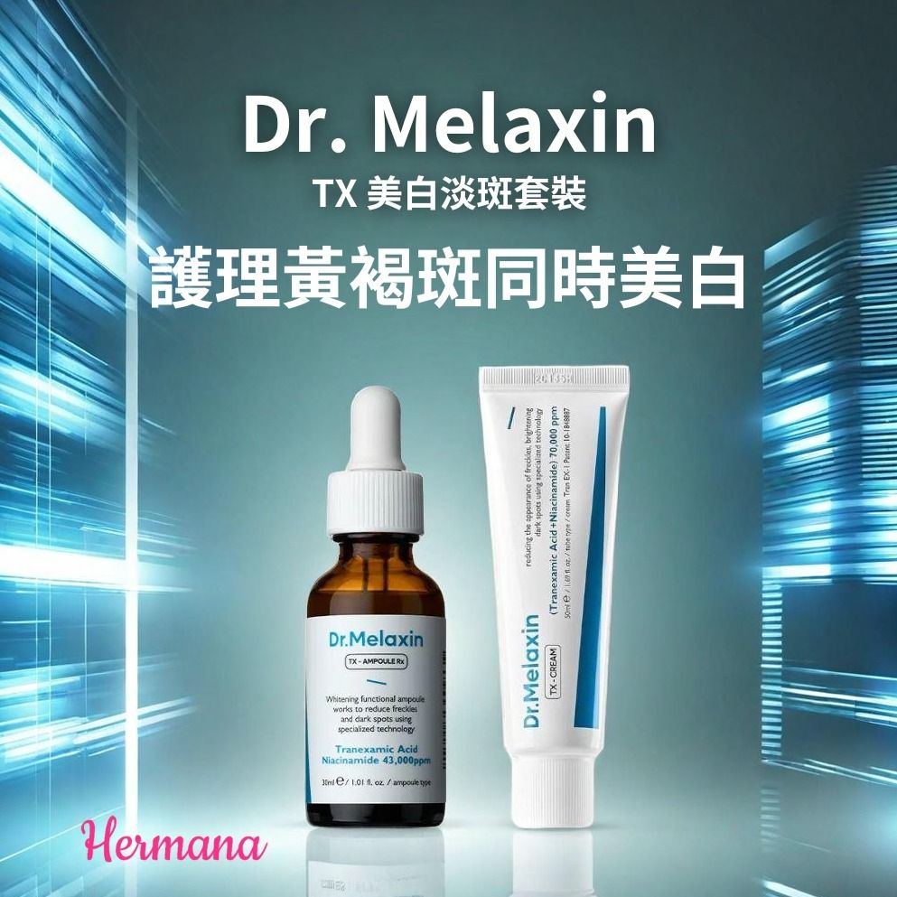 專為改善膚色不均、淡化斑點而設計。這套裝包含兩款核心產品:Dr. Melaxin TX 強效修護美白精華RX 和 Dr. Melaxin TX 強效修護美白去斑面霜,能夠全方位改善肌膚問題,讓您擁有白