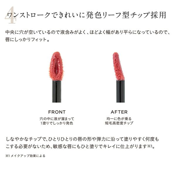 POINT03 採用葉形尖頭。一塗即可美麗上色。隨著更新,採用了葉形的尖頭。尖頭中間有孔,吸液性好,適度寬平,能緊密貼合雙唇,一塗即可達到美麗的效果。