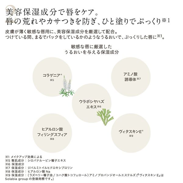 ※1 為因乾燥而變得暗沉的雙唇提供滋潤※2 二異硬脂酸二酯(異硬脂酸/植物固醇)、二異硬脂酸(植物固醇/異硬脂酸/鯨蠟硬脂醇/硬脂醇/貝赫尼醇) ※3 白花羽扇豆種子提取物※4 脯氨酸※5 保濕成分:透明質酸鈉※6 (覆盆莓種子油/琥珀酸生育酚)氨基丙烯酸酯(維他命E?是Solabia Group的註冊商標。)※7 整膚成分:葡萄糖苷柚皮素※8 經過貼片測試,不刺激測試。(並非所有人都不會出現皮膚問題或皮膚刺激。)