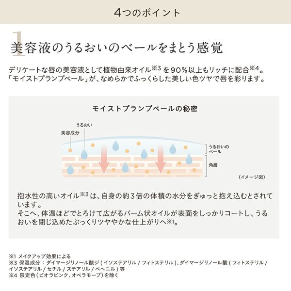 POINT01 機能性植物油※2含量超過90%,為雙唇包裹著滋潤。高密合度的質地像敷面膜一樣滋潤嘴唇,溫和地包裹著。此外,還大量添加了作為美容成分的功能性植物源油。這種功能性植物源油具有吸收超過自身兩倍以上水分的特性(保水性),將這種油作為基底,隨著使用時間的增長,潤澤感增加,引導出飽滿滋潤的雙唇。