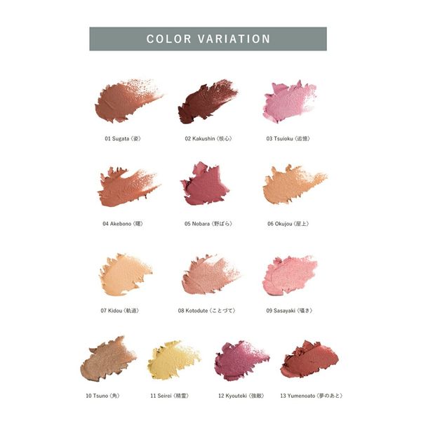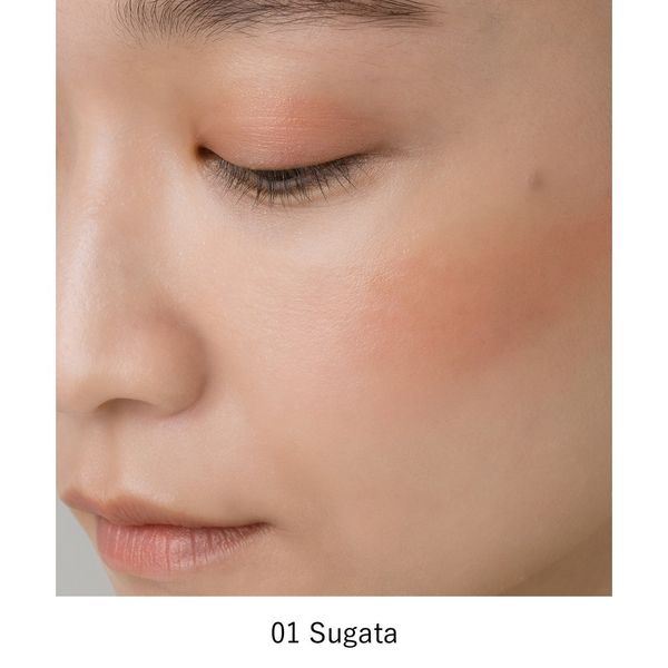 01姿〈Sugata〉:不含珍珠光澤的棕褐色,自然強調骨架的同時增加血色感,營造出高貴印象。適用於腮紅、唇彩或眼妝基底。