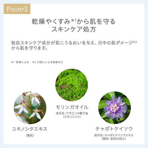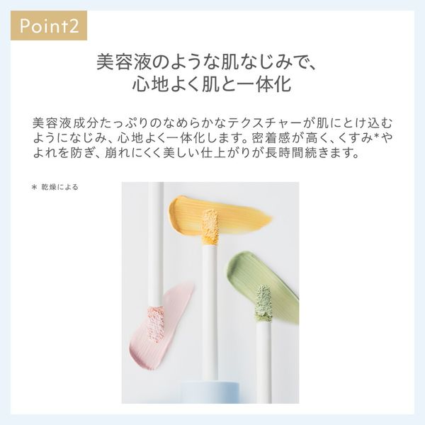 富含美容液成分的絲滑質地宛如融入肌膚般貼合,帶來舒適服貼感。配方含礦物粉體與3種天然植物油,延展滑順並緊密貼合。結合植物來源的成膜成分*1,使妝容不易脫妝,持久維持美麗效果。