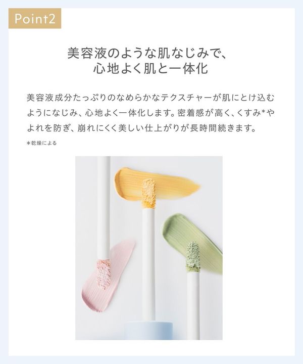 可依肌膚困擾與部位選擇的3色色彩變化。於不厚重的前提下遮飾肌膚困擾,並實現明亮透明感*1的肌膚,配方添加紅色透過型二氧化鈦*2。