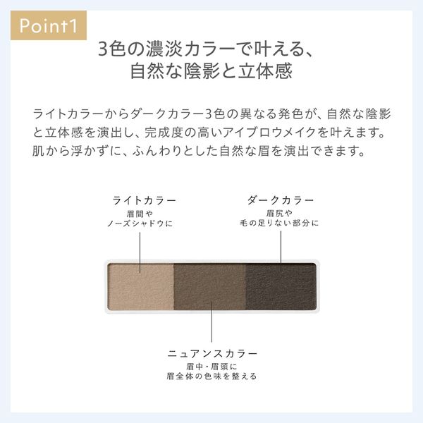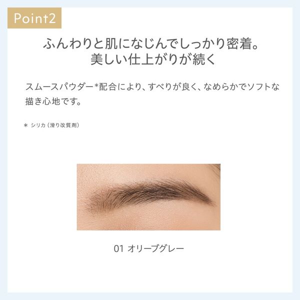 柔霧般的自然陰影與立體感。不易暈染,帶來持久的自然妝感。以具立體感的妝效打造蓬鬆自然眉,美麗妝感長時間維持。