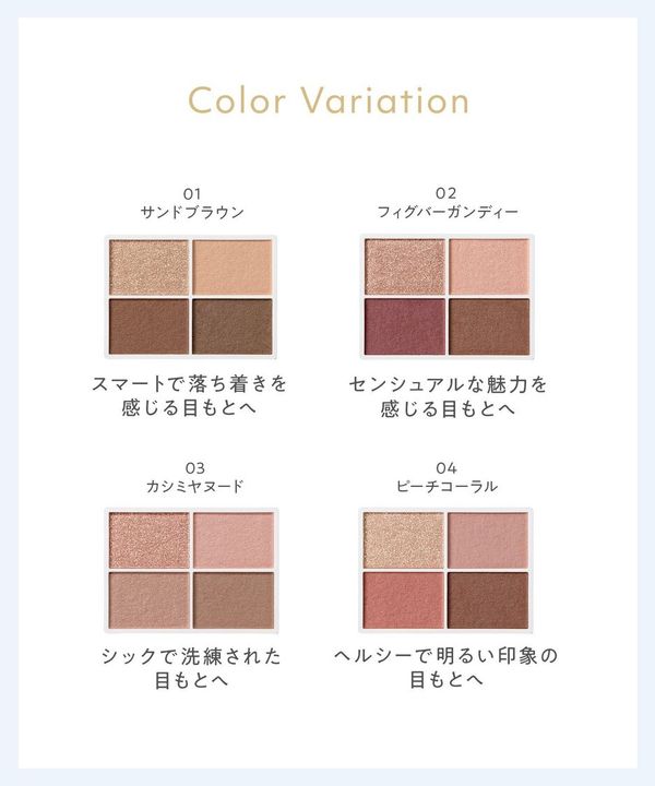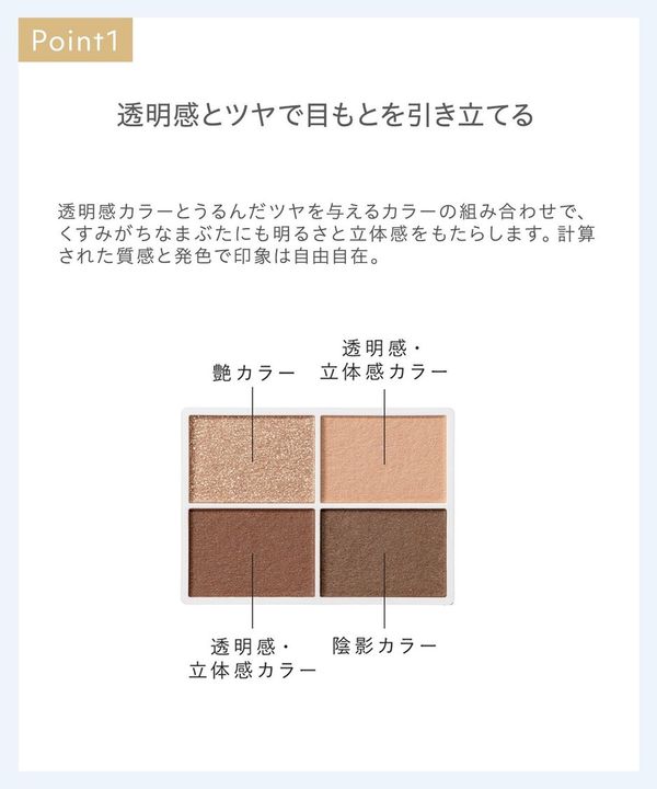 以透明感與光澤襯托眼周。透明感色與水潤光澤色的組合,為容易顯得暗沉的眼皮帶來明亮度與立體度。透過精心拿捏的質感與發色,自由轉換印象:僅疊加明亮色,打造輕盈通透的氛圍眼;疊加陰影色,演繹更深邃的眼神。