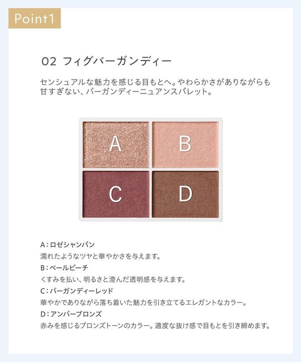 B塗抹於整個上眼窩與整個下眼瞼。C自上眼瞼睫毛根處向上暈染至眼窩的一半或中央。D沿上眼瞼睫毛根處柔和暈開以收斂眼形;亦可細緻疊加於下眼瞼睫毛根處。A可再疊加於眼窩,或點綴於眼頭、眼尾與睫毛根處,享受珠光層次與色澤變化。亦可依喜好單色使用。