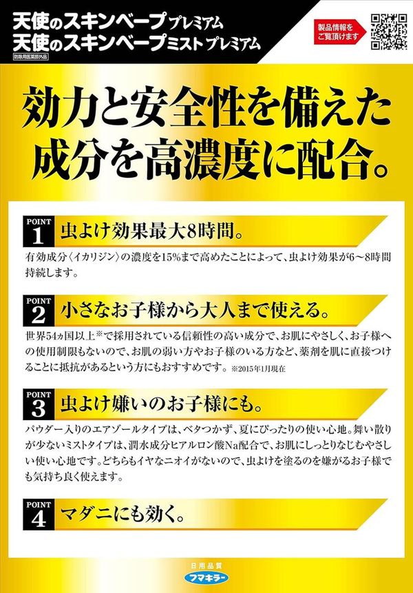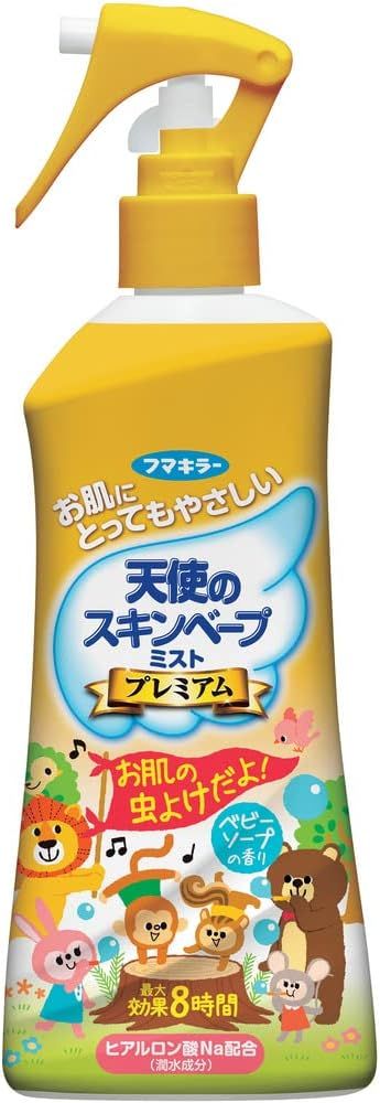 含有透明質酸鈉,一種對皮膚溫和的保濕成分。飛散少,沒有難聞的氣味,即使是不喜歡使用驅蟲劑的孩子也可以放心使用。