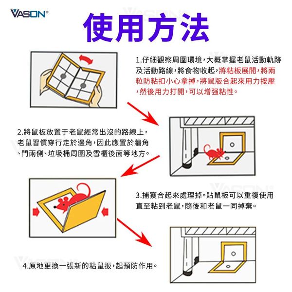 3.捕獲老鼠後可直接合起來處理。(粘鼠板可以重覆使用直至粘到老鼠,隨後和老鼠一同掉棄。 )
