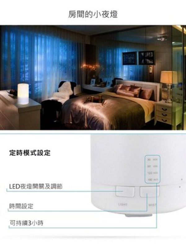 去除甲醛等有害物質,擴散香味,使室內空氣變的格外清新亮度和噴霧可分別調節,即可單獨當做燈具帶有兩檔亮度調節按鈕,可做床頭燈和夜燈使用噴霧可設置 4 組時間,最短 30 分鐘,最長達 3 小時無水自動斷電關閉,安全放心