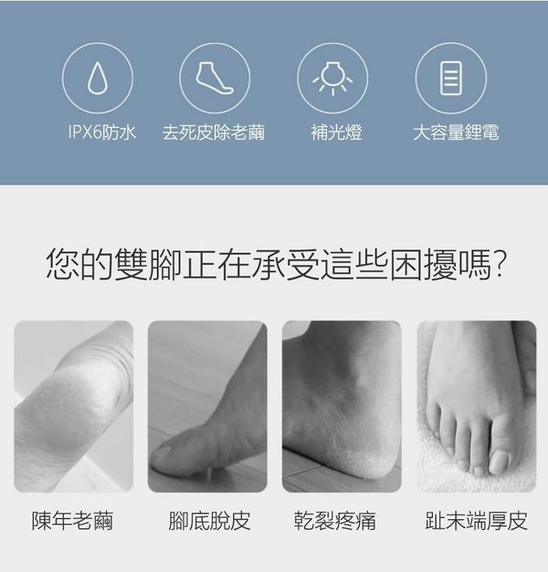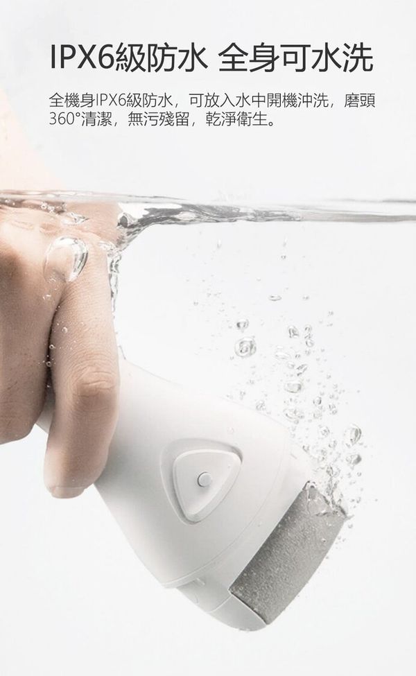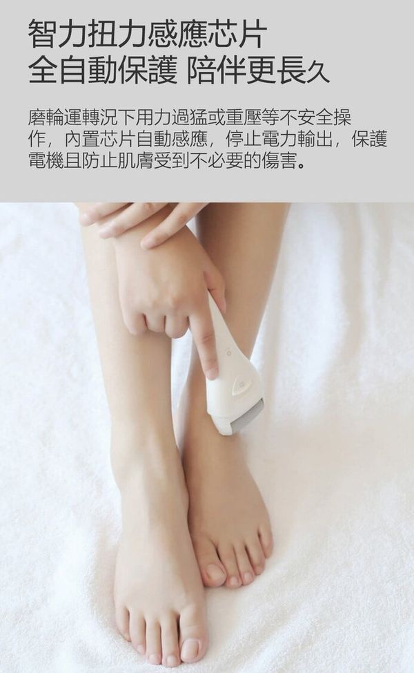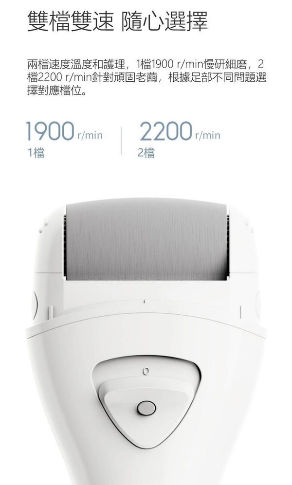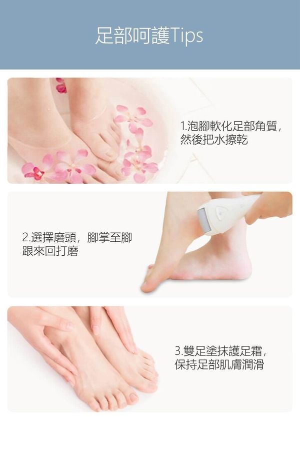 3款磨頭: 三種粗細不同的磨砂顆粒,修護多種足肌 雙檔調速: 1擋1900 r/min慢研細磨,2檔2200 r/min針對頑固老繭 智能扭力感應芯片: 用力過猛或重壓等不安全操作,內置芯片會自動停止電力 LED輔光燈設計: 細微處也清晰明瞭,不留瑕疵 全身可水洗: 可放入水中開機沖洗,磨頭360°清潔