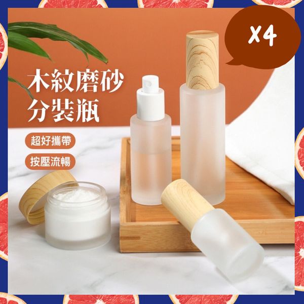 4個 磨砂玻璃木紋分裝瓶 玻璃分裝瓶 便攜樽 噴霧瓶 出國 去旅行 外出 DIY乳液 保養品分裝 化妝品 乳液 精華液 卸妝水分裝 消毒酒精樽 大小容量分裝(4款各一/木紋噴樽50ml+木紋噴樽100