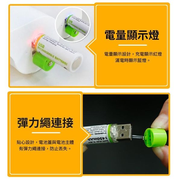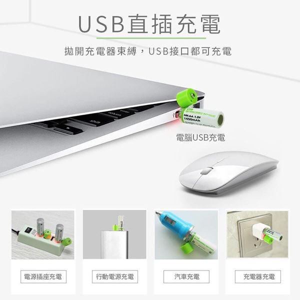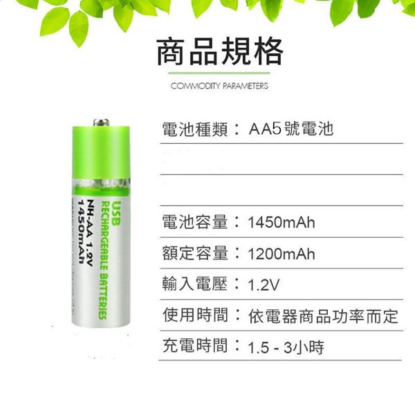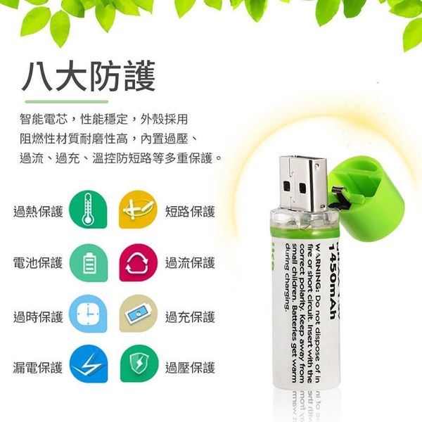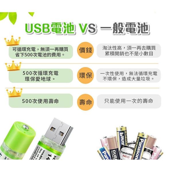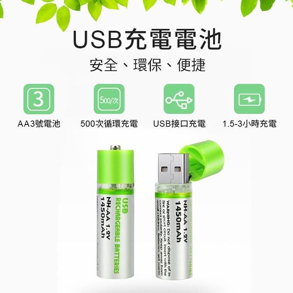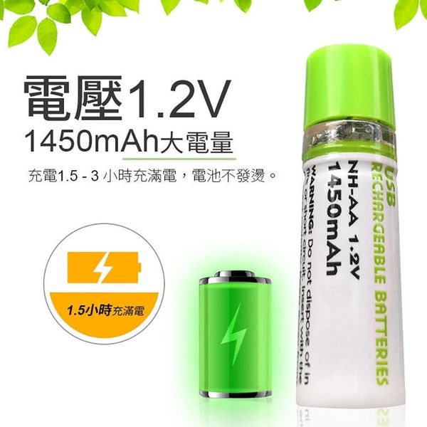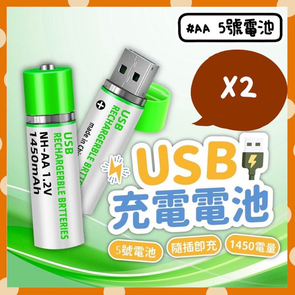2個 USB充電電池 超級䶨性電池 AA電池 5號電池 五號電池 環保電池 可充電電池 可重用電池 重複使用電池 綠色電池 USB充電AA電池(1450mAh/AA電池 5號電池/2個套裝) AA 電