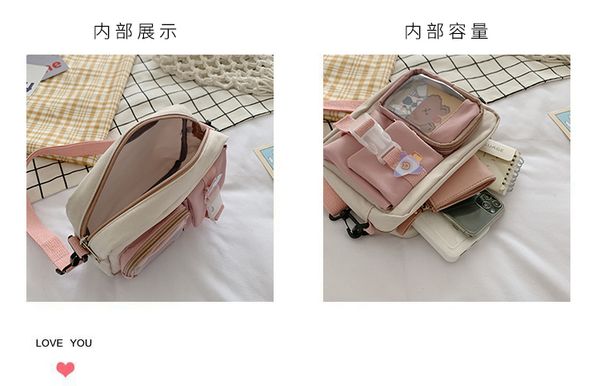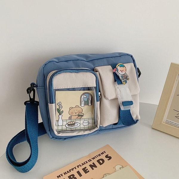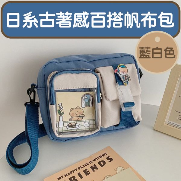 日系古著感可愛帆布包|大容量 附透明展示格 學院風斜孭袋|動漫二次元透明襟章吧唧棉花娃娃痛包痛袋娃包|百搭斜挎包斜孭袋斜背包小包包|校園兒童小朋友女生少女外出旅行手機包單肩包(藍白色)