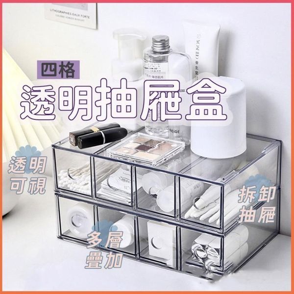 透明收納盒 置物盒 可疊加透明抽屜收納盒 紙膠帶 發夾收納盒 鋼筆收納 桌上 四格收納