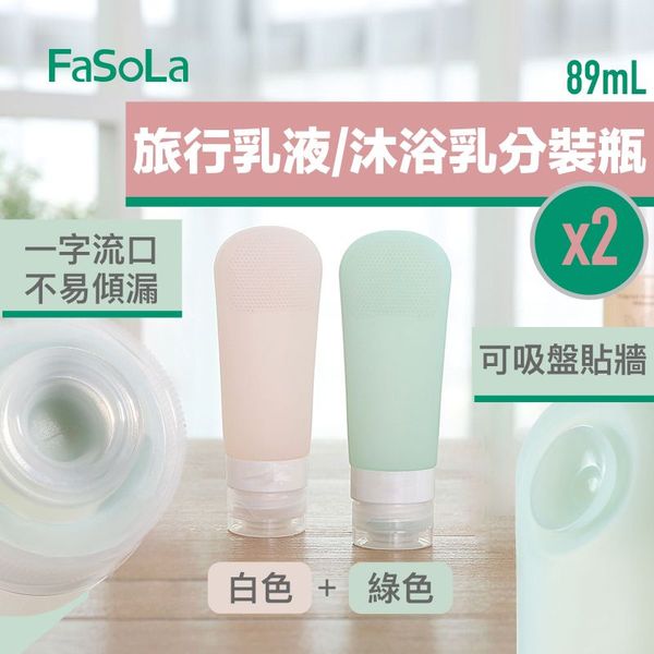 FaSoLa 旅行乳液/沐浴乳分裝瓶(2個)防漏矽膠吸盤刷頭沐浴露洗頭水洗髮水洗髮精護髮素化妝品護膚品分裝瓶 柔軟外出便攜乳液瓶(白色+綠色;89mL)