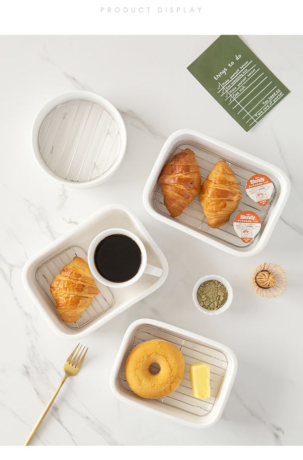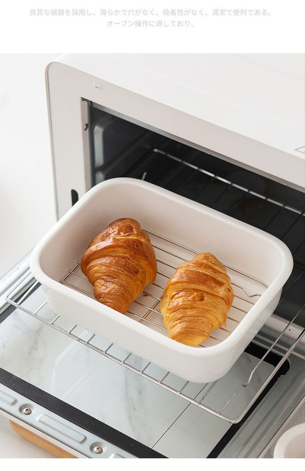 日式陶瓷烤焗盤 連不鏽鋼網架 小型早餐下午茶麵包烤盤 微波爐洗碗碟機氣炸鍋冰箱烤箱焗爐適用 甜品烘培焗飯焗麵用 家用烤箱烤盤碗 白色帶鐵網方盤子 餐具餐盤(小號;640mL)