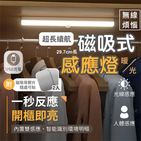 加長版 無線LED智能感應燈|超長續航 充電式人體感應小夜燈|走廊樓梯廁所臥室書桌書檯床頭衣櫃酒櫃燈|便攜拍攝攝影攝像自拍補光燈|戶外野餐露營旅行照明燈(30cm暖光;送磁吸背膠片*2+USB充電線)