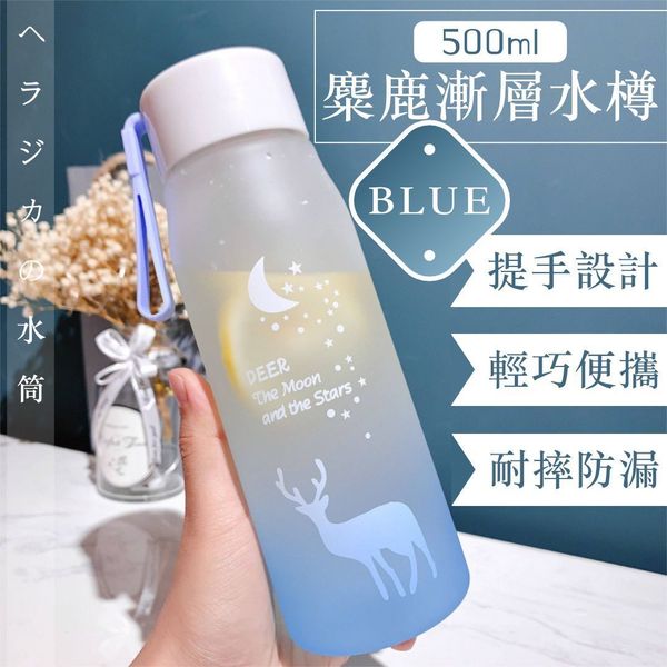 日式麋鹿漸層水樽(500ml)便攜提手磨砂水壺 耐摔防漏膠樽 日常大容量水瓶 水果檸檬泡水養生瓶 運動水瓶 聖誕節平安夜交換禮物生日禮物 少女女生學生兒童小朋友輕水瓶(藍色)