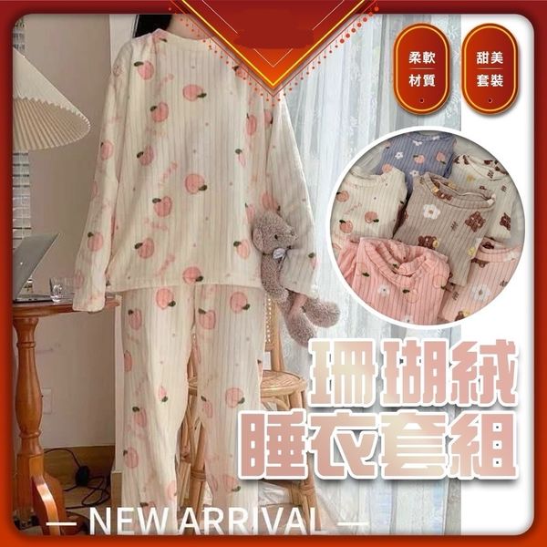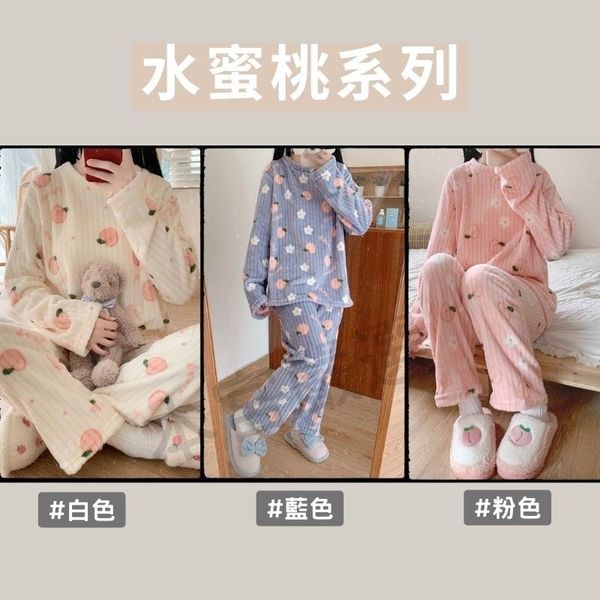 四季長袖睡衣 法蘭絨睡衣 睡衣套裝 家居服 保暖舒適睡衣 (珊瑚絨法蘭絨/白色桃子/均碼)