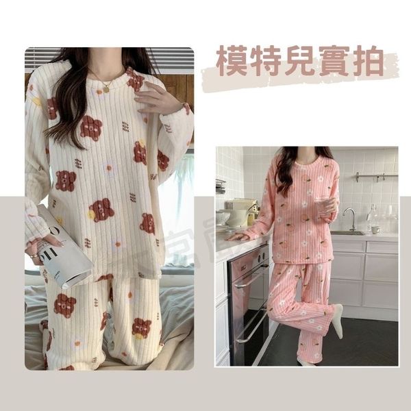 四季長袖睡衣 睡衣 睡衣冬天 熊熊 法蘭絨睡衣 睡衣套裝 家居服 睡衣女 保暖舒適 (珊瑚絨法蘭絨/白色桃子/均碼)