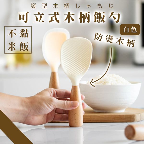 【不黏飯粒】可立式木柄飯勺|耐高溫 無異味 不變形 矽膠飯杓 可懸掛飯殼 站式飯勺 不沾黏飯勺 打飯勺 家用廚房電飯煲飯匙 米飯鏟 盛飯勺(白色)