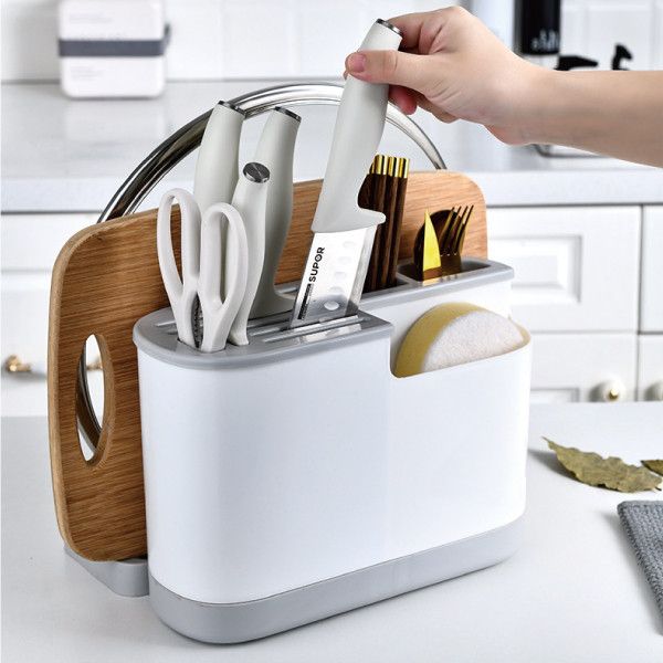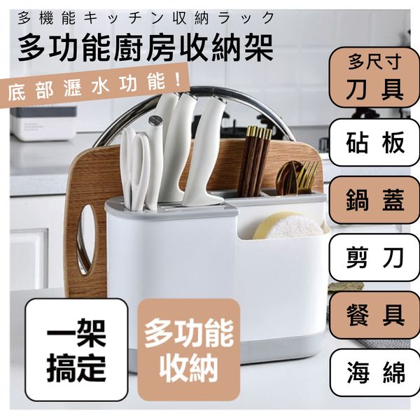 【乜都放到】七合一廚房收納架|瀝水功能 附多尺寸刀具+砧板+鍋蓋+剪刀+餐具+海綿收納槽 節省空間|日式無印風筷籠 筷子架 叉子匙羹湯匙收納筒 桶 刀架 菜板 一體式廚房用品 廚房掛架 置物架 瀝水籃 百潔布收納置物架