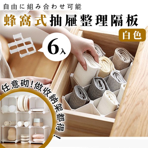 【自由組裝】蜂巢式抽屜整理隔板(6個)內衣/襪子/內褲/絲巾/毛巾 衣櫃櫃桶收納格|文具/化妝品/小物桌面/書檯/化妝桌收納盒 收納架 層架|盲盒扭蛋手辦公仔展示架|多功能桌上及電線收納 儲物盒(白色