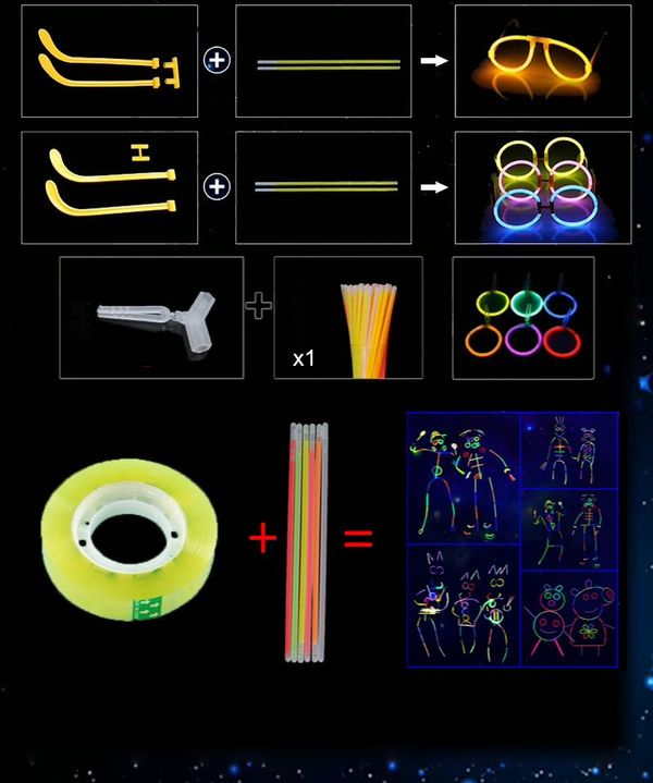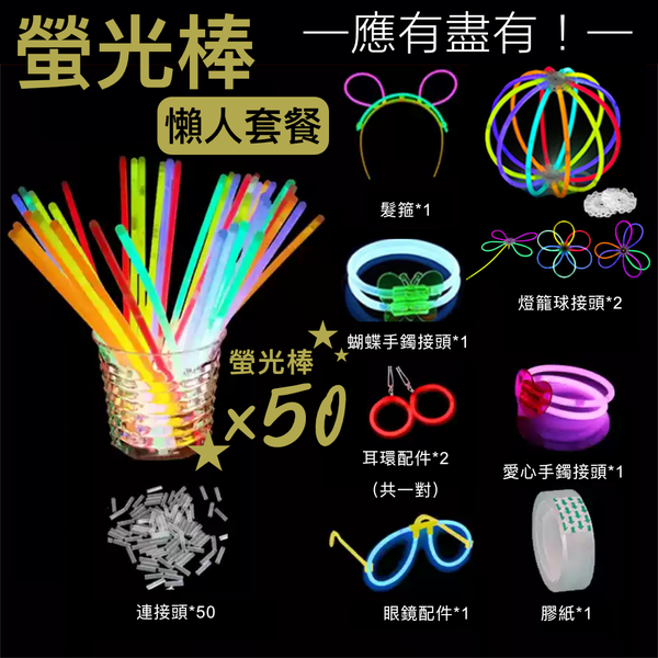 暢玩組合!發光螢光棒+多款配件(懶人套餐)安全無毒 加亮加厚 中秋必備 節日生日派對萬聖節慶祝佈置演唱會應援表白活動DIY用 發光玩具 中秋燈籠 小朋友兒童手環眼鏡球耳環髮箍頭箍膠紙膠帶 一次性夜光棒