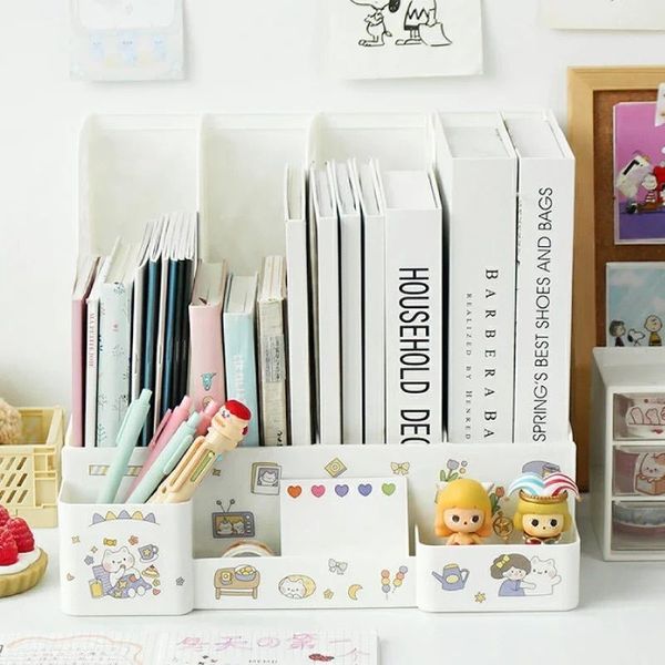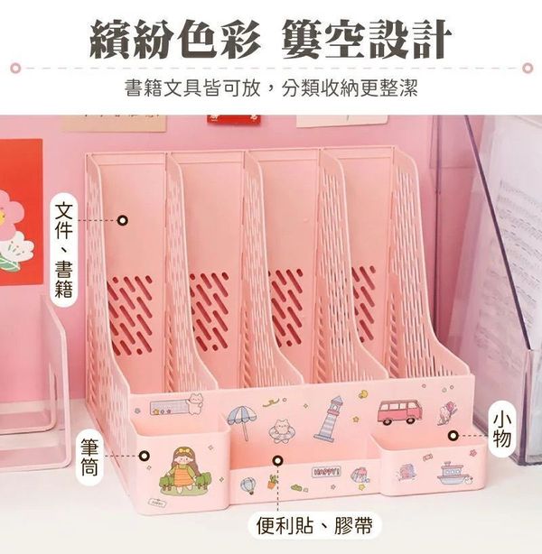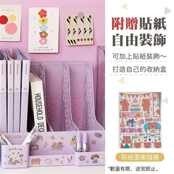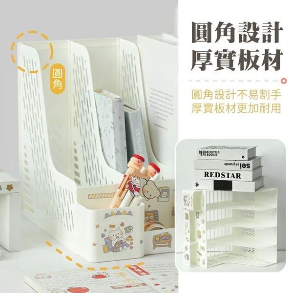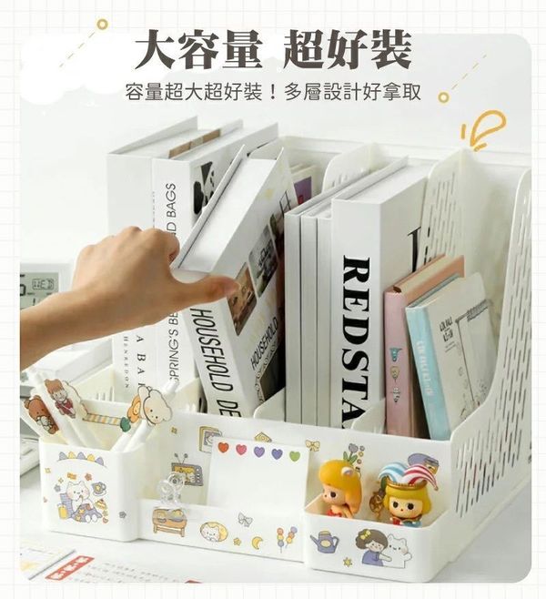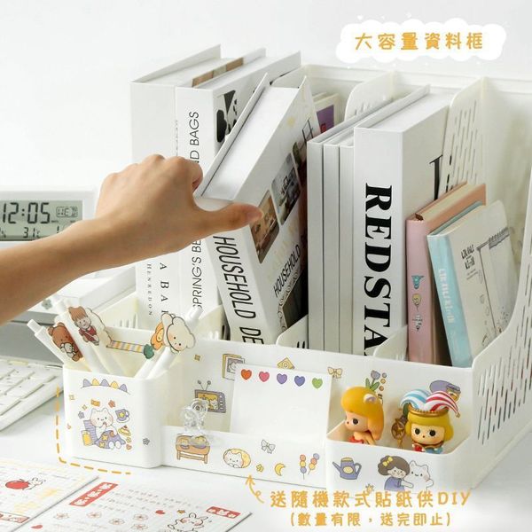 連筆筒!7格桌面文件整理盒(送限量隨機款式DIY貼紙)超大容量書擋|桌面雜物資料分類收納盒|辦公桌Office兒童小朋友學生書桌檔架文具文件收納夾 文件架 書立盒 書本書籍筆記本iPad置物架(白色)