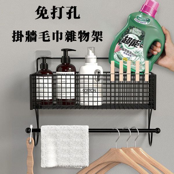 免打孔浴室掛牆式毛巾什物架 浴室收納架/毛巾架掛架/廚房置物架 - [免打孔/打孔兩種安裝] - 黑色