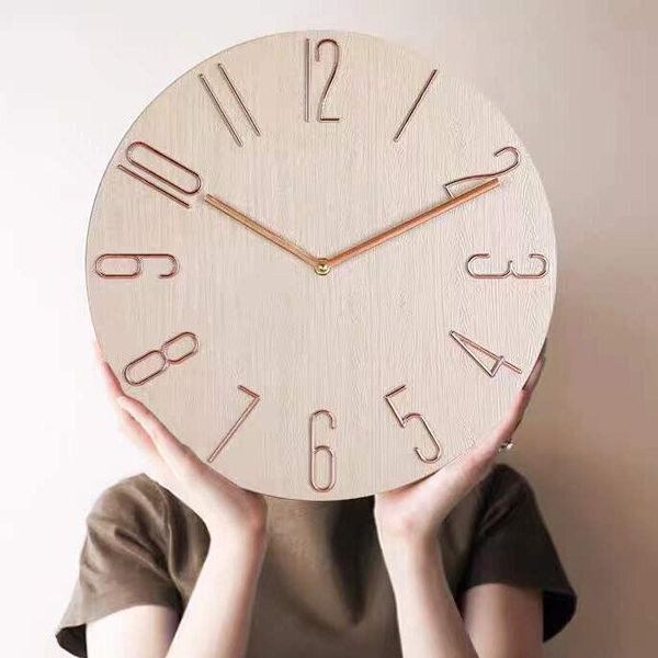 12吋 北歐粉木紋立體 凸字 掛鐘 簡約掛鐘 客廳靜音木製時鐘 30cm x 30cm 電子鐘