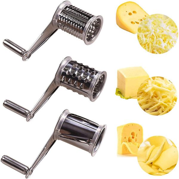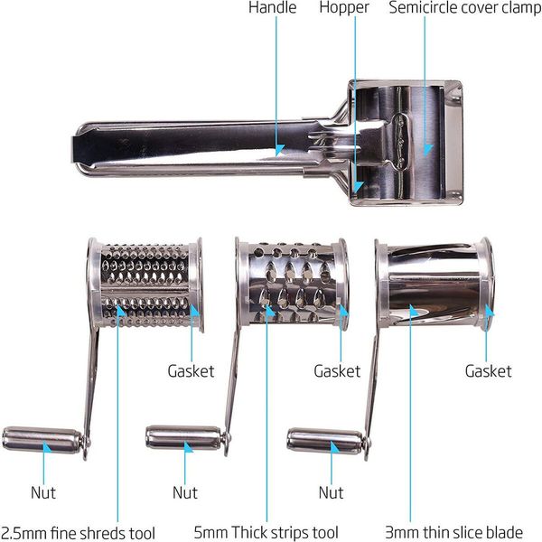 多用途刨絲器: 3 個不同的轉鼓 鋒利的圓筒 不銹鋼刀片,適用於所有類型。您可以將您的成分換成細磨碎或粗磨碎。關於清潔,請務必在使用後用熱水清洗 會在熱水中融化並且不會留在旋轉器上,然後用海綿清洗,這將非常有效。 易於使用:只需將食物放入料斗中,然後轉動手柄即可磨碎或切碎。 輕敲幾下,多餘的芝士應該被釋放出來,你就有了,完美的芝士可以烹飪了!