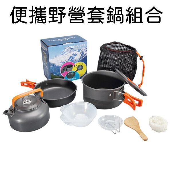 2-3人露營煮食套裝陽極氧化鋁 炊具套裝 Camping 茶壺煮鍋 煎pan火鍋 折疊款煮食鍋 煲 野炊爐具 煮食露營煲 cookset 戶外茶壺套鍋加配件 DS-308套鍋九件套便攜野營套鍋組合