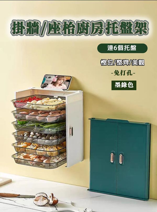 【墨綠色/連6個食物托盤】免打孔兩用掛牆/座枱廚房托盤架 慳位 收納方便 可疊加料理盤 水果 火鍋 備菜盤子 托盤置物架 多層菜盤