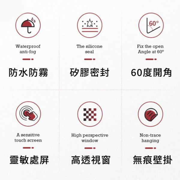 1.防水、防霧 2.適合6.8吋以下手機 3.60°開口,仿卡帶式設計,防止打開時突然開口太大而手機掉落。 4.隨時隨地可追劇直播,解放雙手 5.免打孔。適合多種牆面。黏貼前請將牆面擦乾和擦乾净。 6.高清靈敏觸摸屏 • 防霧高透視窗:即使在沐浴過程中產生霧氣,也不會影響手機屏幕的清晰度。 • 柔性觸摸屏,可自由觸摸,調節音量,更改歌曲,玩遊戲,滾動新聞。 • 防水保護,防水盒可以做到密封保護。 • 通用尺寸,適合6.8英寸以下手機。 • 無痕懸掛:易於粘貼,牢固,穩定,可無痕粘貼。