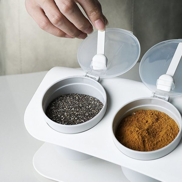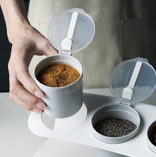 北歐簡約白3格調味盒連架(包匙) 托盤式廚房套裝調料罐附調味匙 三格鹽罐糖罐 味精盒 鷹粟粉 家用塑料佐料瓶 調料罐 調味品罐 無印風生活用品 調味料容器