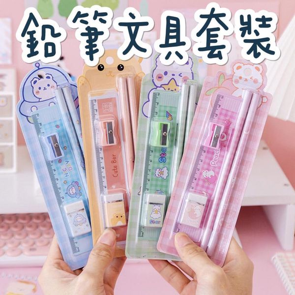 文具套裝開學必備 兒童學習用品 可愛 學生小禮物 卡通文具 熊仔 鉛筆擦膠鉛筆刨間尺文具套裝(黃色小熊)