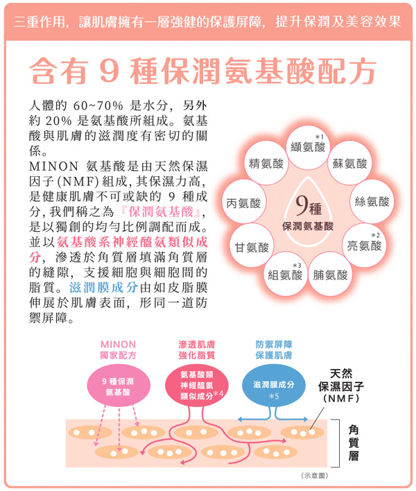 MINON 主力研究護膚聖品氨基酸,每個洗護產品都加入獨家黃金比例配方🏅 #9種保濕氨基酸 + #2種抗糖抗氧美容氨基酸,11種護肌成份keep住滋潤角質層💧、滲透膠原層,抗氧化及抗糖化同時養成0.02mm黃金保水層🤏🏻,引導肌膚水感潤澤,亮白滑溜🧏🏻♀️!
