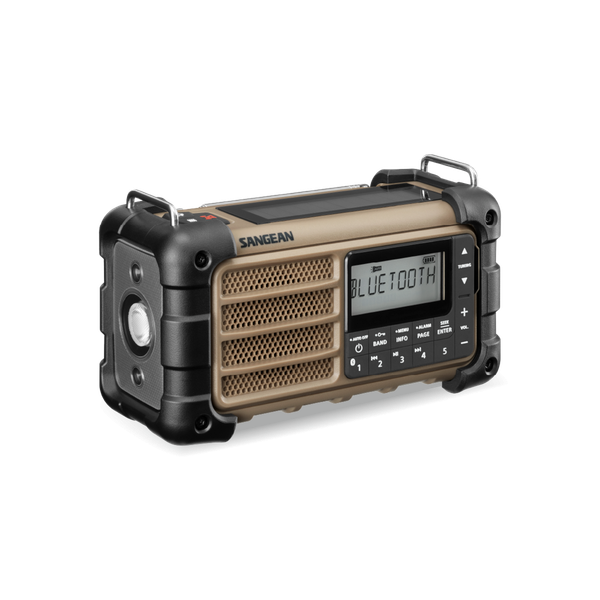 配備太陽能板以及手搖式發電機。收音機可記憶多達 40 個 AM / FM 電台預設,並提供藍牙串流、自動調諧系統 (ATS)、5 模式 LED 手電筒 (包括 SOS 設定) 等功能。它是戶外探險家和緊急使用者最理想的選擇。