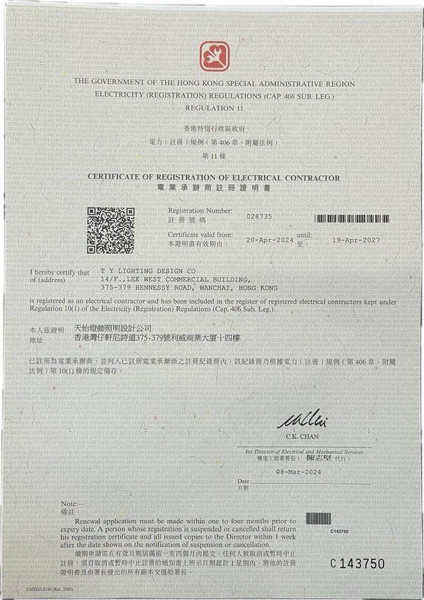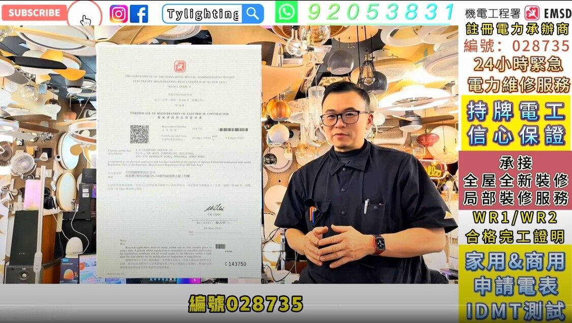 本公司為機電署註冊電業承辦商(028735),所有安裝由持牌電工完成,符合香港電力法規
