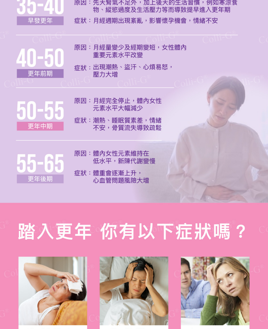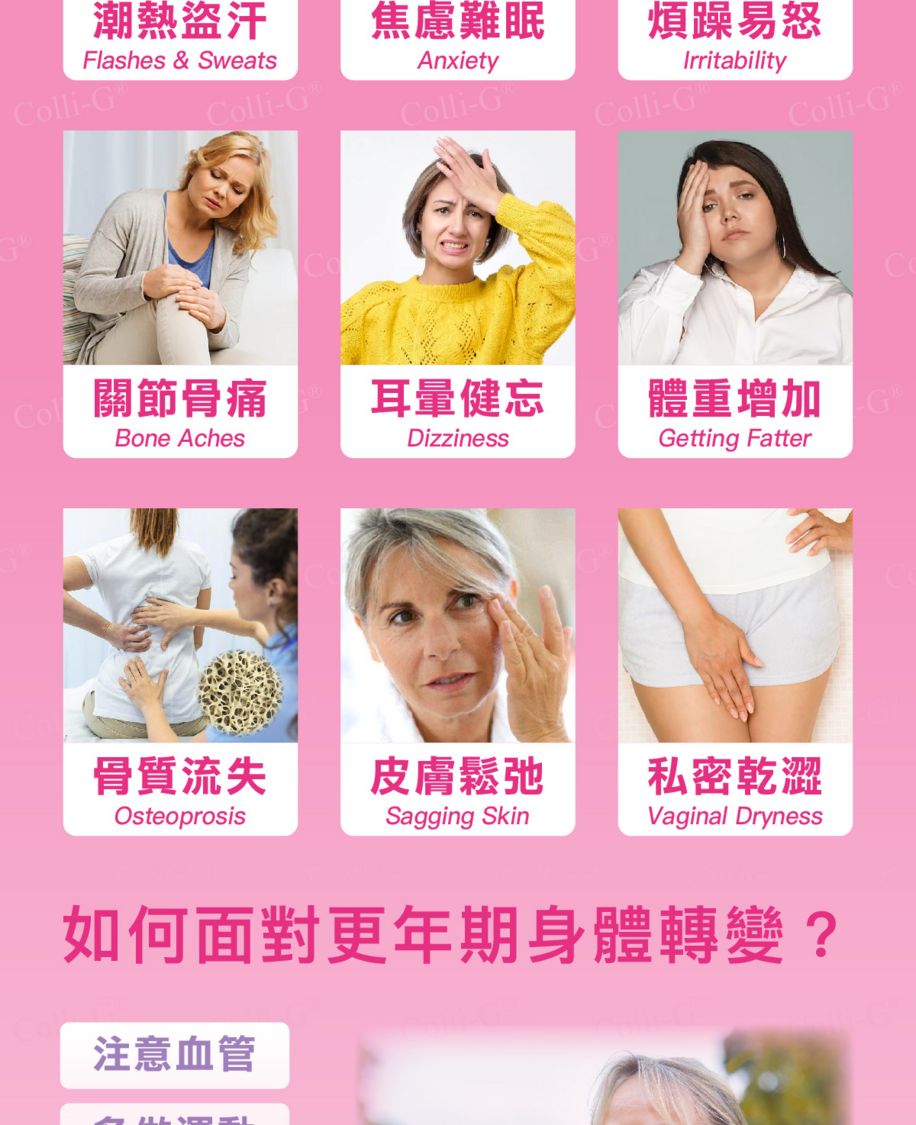 產品簡介 Colli-G 更年舒 MenoCare 以專利 大豆胚芽異黃酮 及 多種有效成分 研製成熟齡黃金配方。臨床實證,每天服用有助舒緩潮熱、盜汗、睡眠欠佳、煩躁易怒、情緒低落、難以集中、頭目昡暈、疲倦無力、關節不適、體重增加、記憶力下降及失去興趣,幫助調理體質、舒適度過更年期。 每粒含40毫克專利大豆胚芽異黃酮及亞麻籽萃取物中的木酚素(SDG) 1.2毫克。木酚素有助降低患上頑疾的風險,維持心血管健康,紓緩更年期不適。 主要功效 ● 減少盜汗、舒緩潮熱 ● 改善睡眠質素 ● 改善煩躁不安、憂鬱、緊張情緒 ● 改善疲勞、集中力 ● 改善夫妻生活 ● 改善關節痛 主要成分 1. 專利大豆胚芽精華(非轉基因) 獨家專利技術,萃取10多種多元大豆異黃酮素,其中木質素異黃酮含量高,比一般大豆異黃酮更有效。配醣基+去醣基技術,保留2種優點,製程採用非有機溶劑萃取方式,安全品質高。長達24小時釋放吸收,維持體內異黃酮水平,增強保健效果。 2. 亞麻籽SDG 提高骨質密度,維持心血管健康。 3. 女王蜂子萃取 對抗疲勞,改善耳暈不適。 4. 蜂王乳 刺激膠原再生,增強免疫功能。 5. 琉璃苣 舒緩情緒,改善月事不調。 6. 紅棗萃取 對抗衰老,補血益氣安神。 7. 山藥萃取 對抗氧化,增強新陳代謝。 適用人士: 針對不同階段更年期研發,女士們可跟據自己的身體情況去服用。 服用方法: 早發更年 35-40歲:每日2粒,調理月事不順,改善情緒不安,延緩更年期 更年前期 40-50歲:每日2-3粒,舒緩潮熱盜汗,改善驚悸善忘 ,提升精神活力 更年中期 50-55歲:每日4粒,調節體內微量元素水平,改善睡眠質素,促進骨骼健康 更年後期 55-65歲:每日2粒,控制體重上升、預防心血管問題,提升記憶力 * 建議服用3個月以上達致最佳效果 注意事項: 孕婦、哺乳期、婦科問題或對成分過敏者,請先徵求營養師意見。本產品含有大豆及奶類製品。 產品規格: 每盒60粒,每粒600毫克 (含膠囊) 產地:台灣 #Colli-G #更年舒 #更年期 #潮熱 #陰道乾澀 #盜汗 #多汗 #情緒煩躁 #更年期症狀 #停經 #女人40 #更年期煩惱 #失眠 #健忘 #肥胖 #膽固醇高 #大豆異黃酮 #雌激素 #荷爾蒙 #骨質疏鬆 #乳腺癌 #炆憎