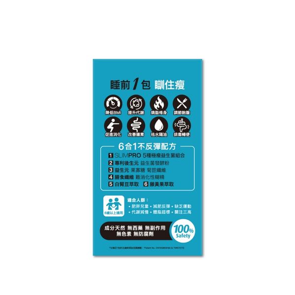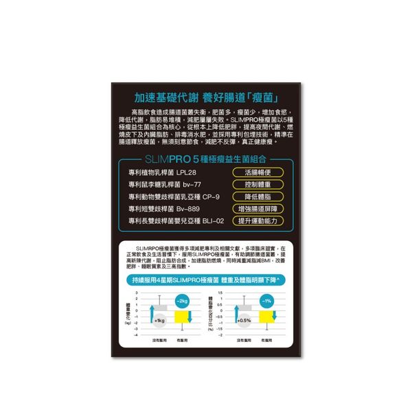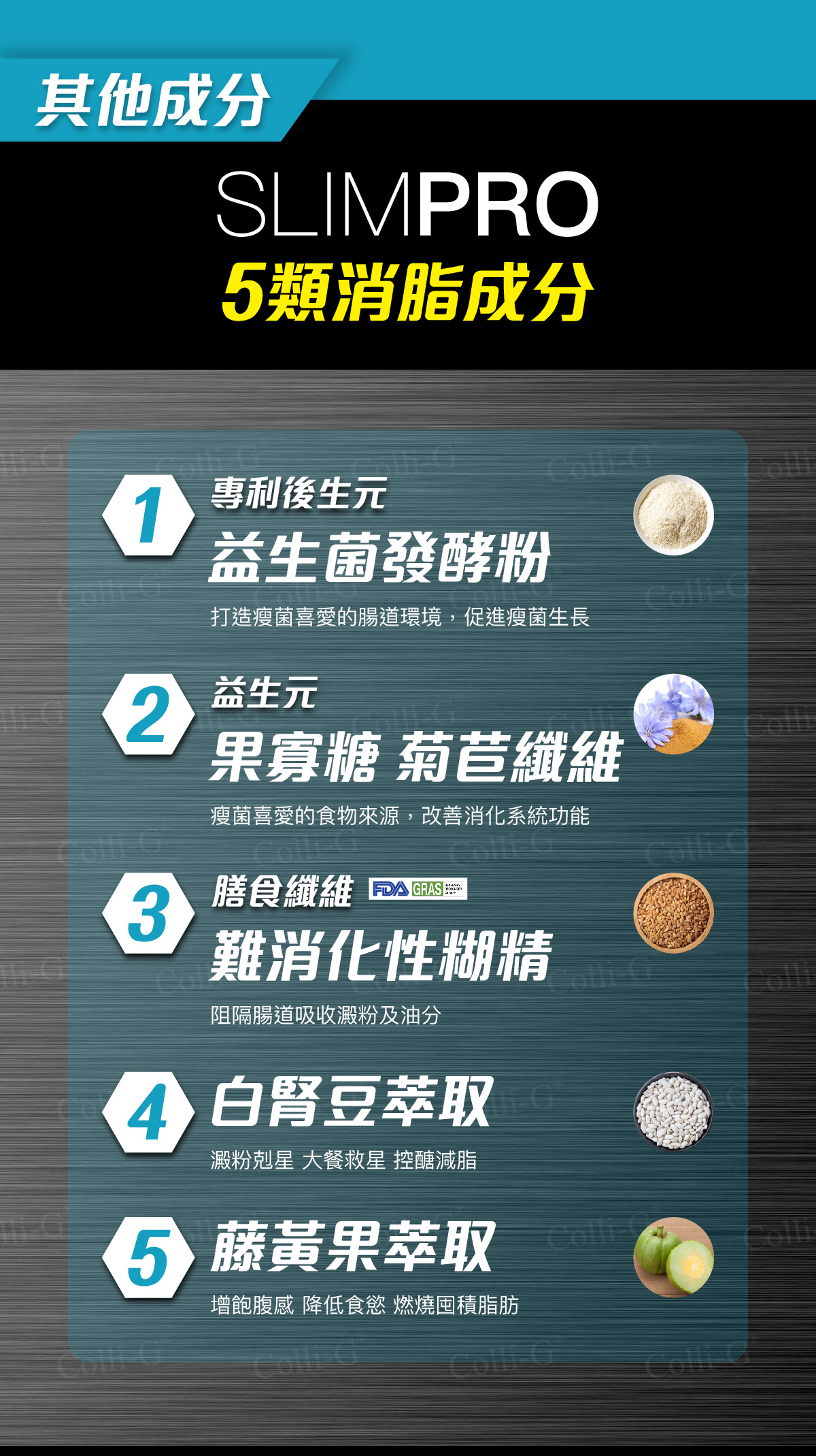 主要成分:SLIMPRO 5種專利極瘦益生菌組合