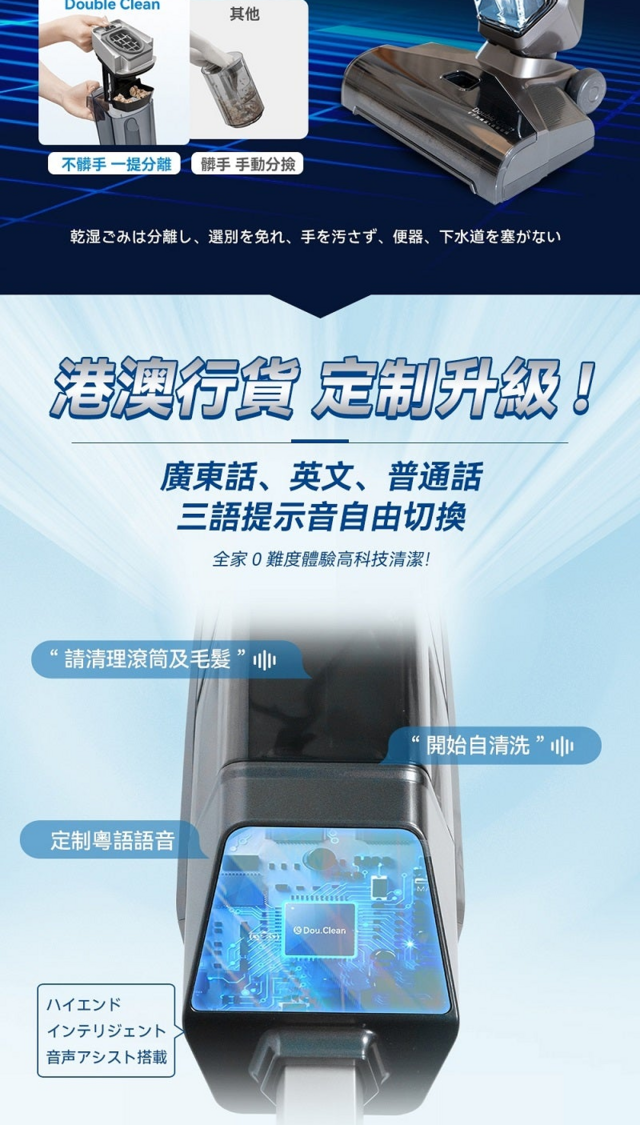 【產品參數】 1.品牌:Double Clean 2.產品名稱:無線自淨自烘抑菌乾濕掃拖吸塵機 3.產品售後:香港、澳門 4.產品保養:1年 5.產品產地:日本品牌,中國製造 6.顏色:黑色 7.包裝清單:產品主體、充電底座、說明書、彩盒、外箱、過濾網、清潔刷子 8.主要材質:ABS、PP 9.功率:250W 10.額定電壓:28.8V 11.產品重量:4.8KG 12.電芯容量:4000 mAh 13.吸力:12500Pa 14.滾刷轉速:高檔2500r/min,標準檔2000r/min 15.滾刷自清洗功能:有 16.滾刷烘乾功能:有(40℃左右) 17.噪音:<72dBA 18.清水箱容量:600ml 19.污水箱容量:550ml 20.語音功能:有 【產品特點】 1.吸拖洗一遍過,不留水漬不彎腰,一鍵自清潔。 2.滾刷快速熱烘自清潔,避免滾刷發霉發臭。 3.水箱上吸水設計,防止滴漏和堵塞,貼心細節更省心。 4.每分鐘擦地2500次,12500Pa超大吸力 ,洗掉頑固污跡。 5.乾濕垃圾分離,免分揀不髒手,不堵馬桶、下水道。 6.全風道堵塞報警,防止機身二次污染。端口精密監測,風道、滾刷、進風口、污水箱和過濾網都有監測提醒,機器清理更科學更全面。 7.洗淨縫隙邊角,2合1滾刷,專業防手刷。 8.活水洗地更乾淨,邊拖邊洗拖布。 9.智能粵語語音交互功能,語音提示操作,輕鬆簡單上手。