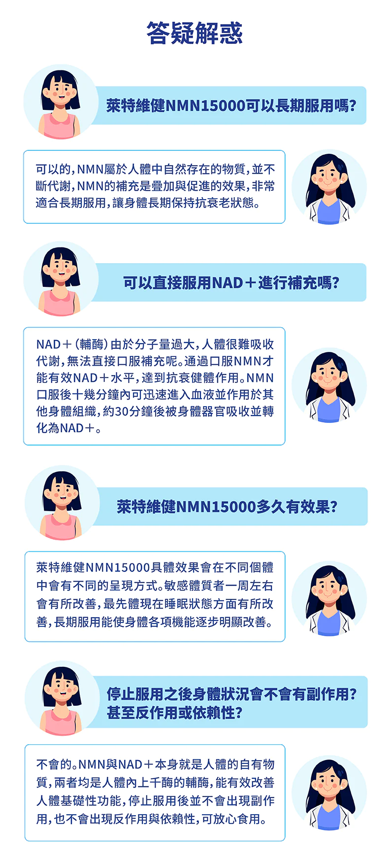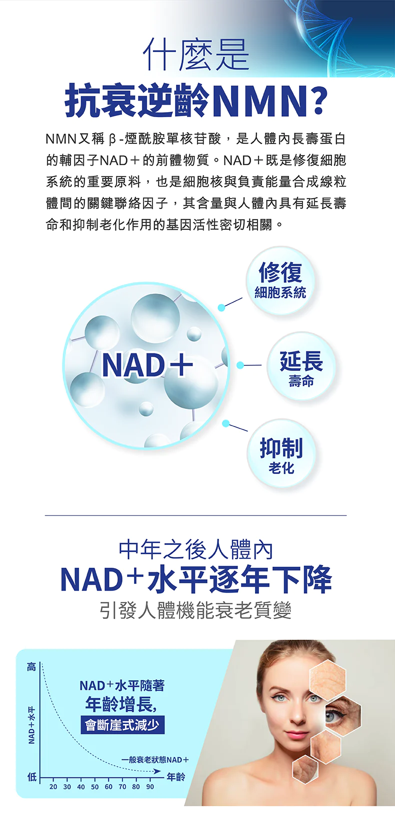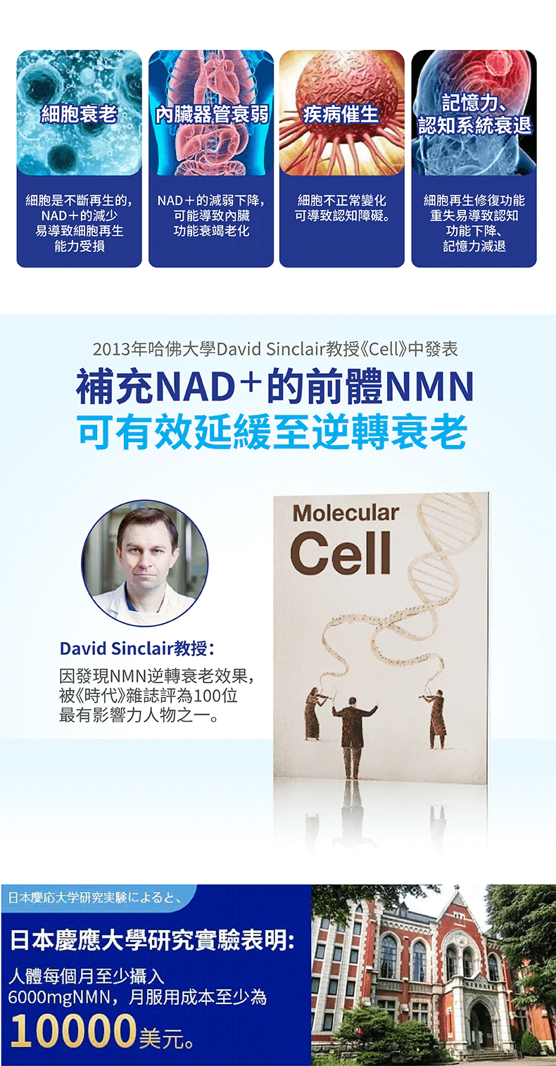 NAD 補充劑、修復 DNA、抗衰逆齡、身體機能年輕化、改善睡眠。
