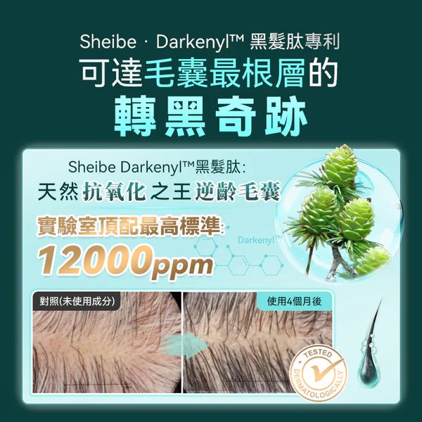1. 日本獨家配方設計,從根源和本質去改善和調理白髮,核心添加瑞士專利Sheibe-Darkenyl黑髮肽合計12000ppm,可達毛囊最深層的轉黑奇跡,擁有超強抗氧化能力、更高活性和更卓越的逆齡毛髮效果,其臨床實驗證明,實驗人群使用4個月後,平均白髮比例減少17%,減少比例是安慰劑組的2倍以上,其中一例最佳測試結果是白髮比例從原本的90%減少到只有40%,白髮面積大幅降低。
