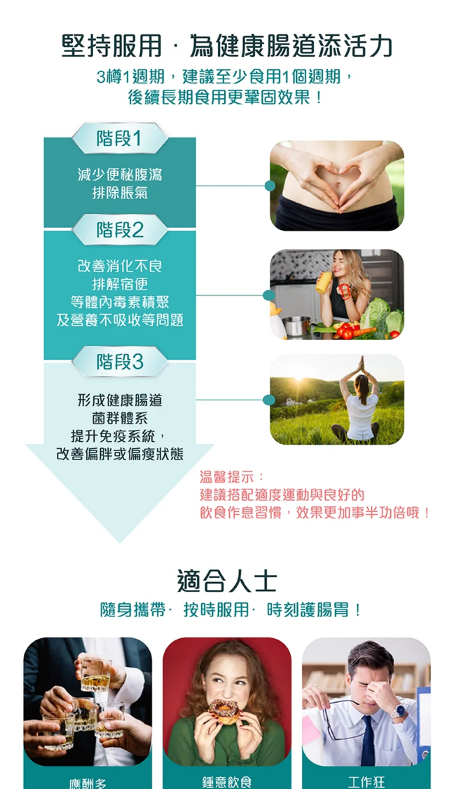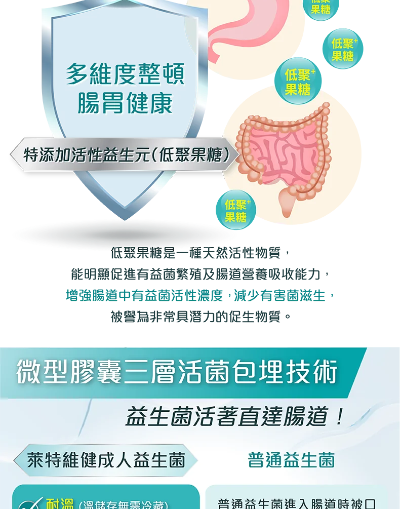 主要成份:17種益生菌(嗜熱鏈球菌,植物乳桿菌,副乾酪乳桿菌,鼠李糖乳桿菌,乾酪乳桿菌,長雙歧桿菌,動物雙歧桿菌,短雙歧桿菌,發酵乳桿菌,瑞士乳桿菌,羅伊氏乳桿菌,乳酸乳球菌,嗜酸乳桿菌,兩歧雙歧桿菌,格氏乳桿菌,約氏乳桿菌,唾液乳桿菌),低聚果糖,硬脂酸鎂。保健功效:調理腸胃,改善便秘及腹瀉,改善消化功能,保護腸道健康,強化免疫系統及有效減輕注射疫苗後的副作用。食用方法:每日 1 次,每次 2 粒產品規格:每樽 60 粒,每粒 440 毫克