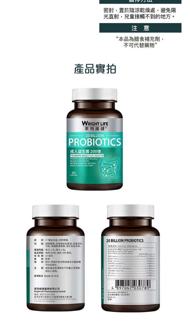 【82折】限時優惠 【萊特維健】成人益生菌 200億 60粒/樽 調理腸胃,改善便秘及腹瀉,改善消化功能,保護腸道健康,強化免疫系統