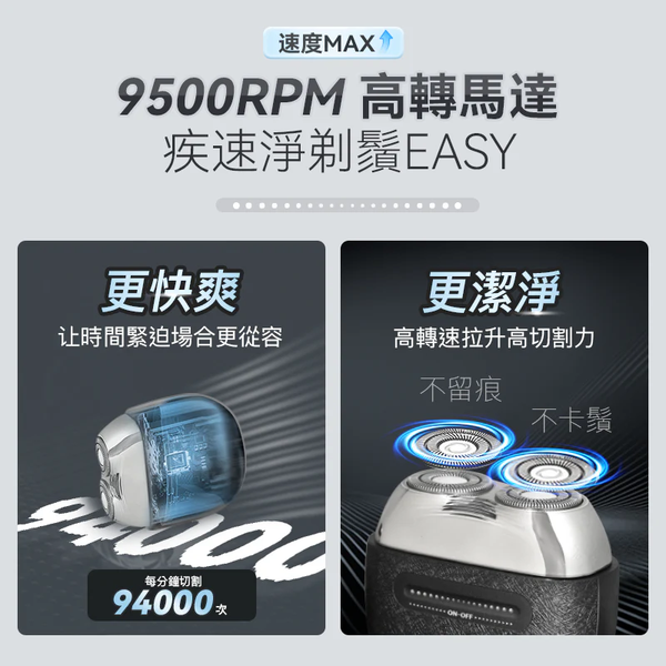 3、9500rpm高速電機搭配30刀不鏽鋼刀片(更耐用,其他多為國產精鋼刀片),每分鐘94000次切剃次數,高效剃須。