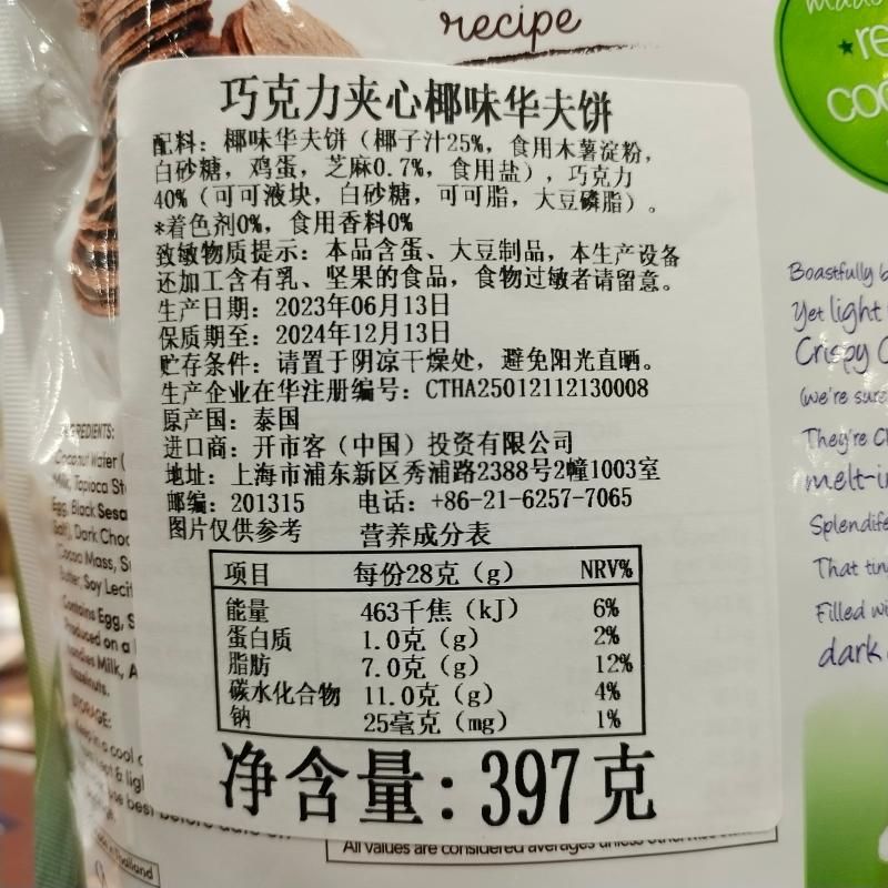 開市客代購 泰國進口餅幹零食黑巧克力夾心椰味華夫餅薄脆餅397g Costco代購Costco正品代購Costco專業代購